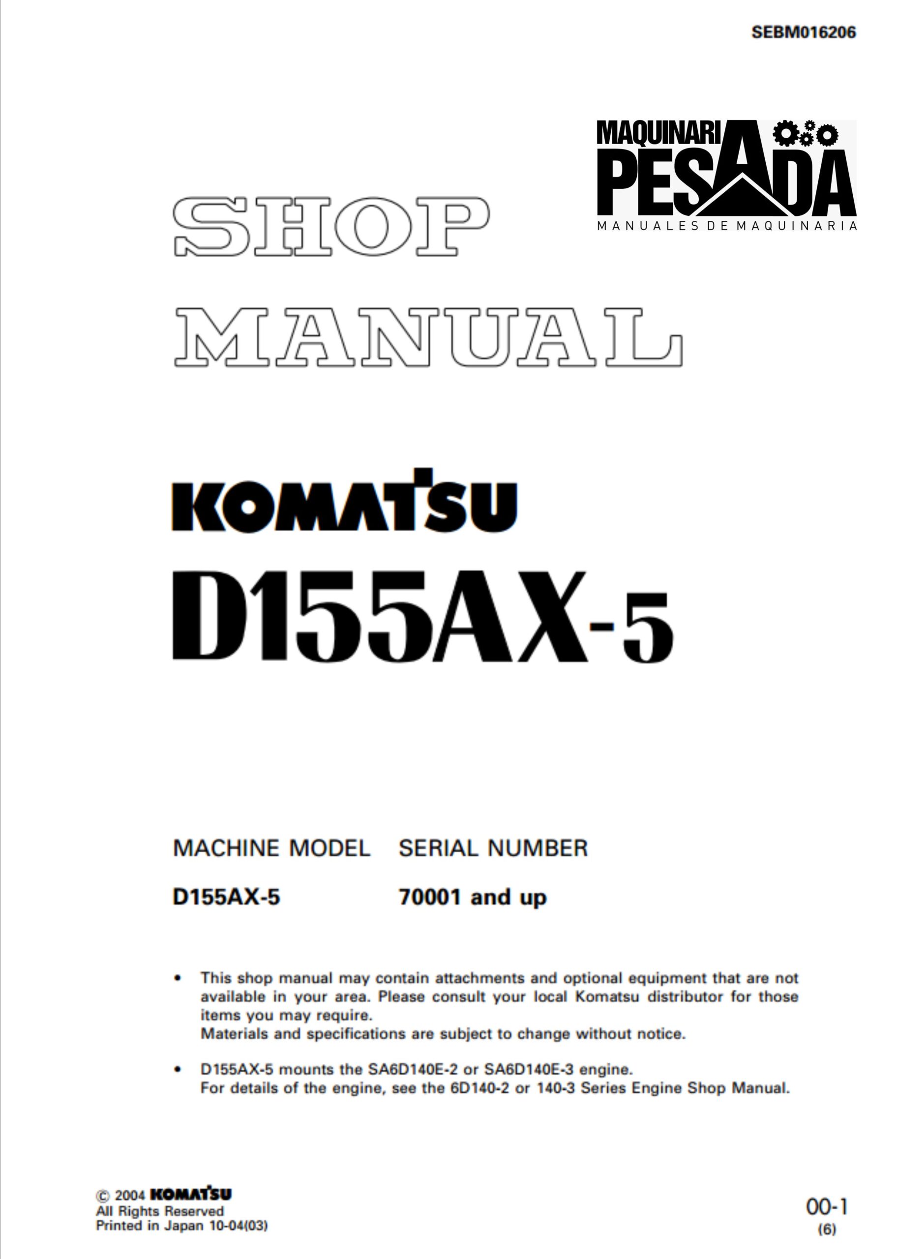 BULLDOZER KOMATSU D155AX-5 SERIAL NUMBERS – 70001 and up